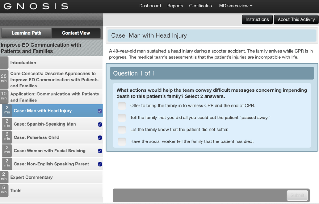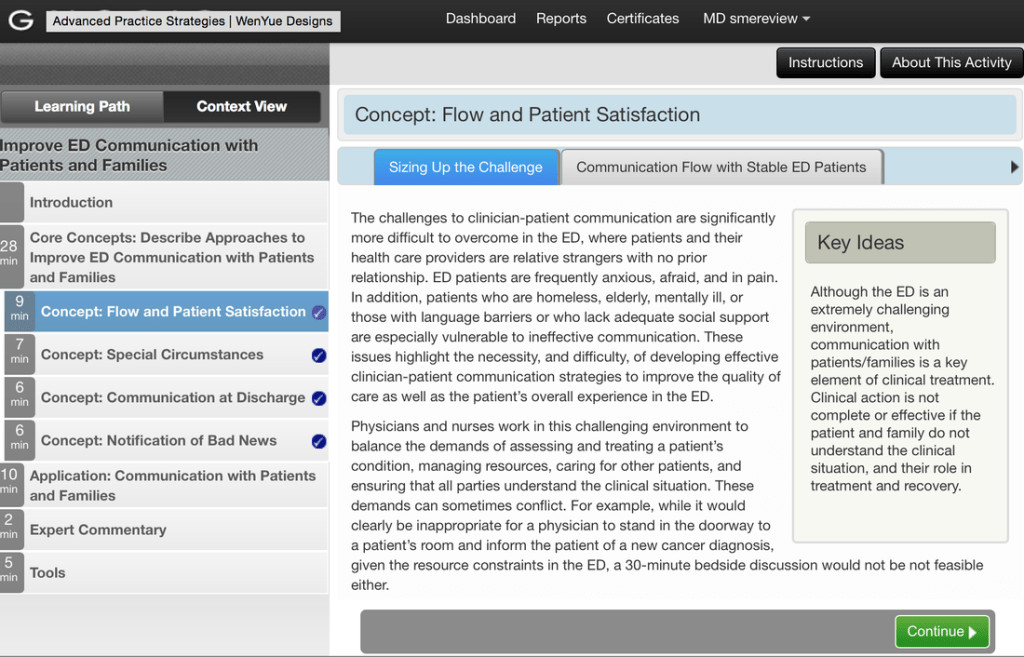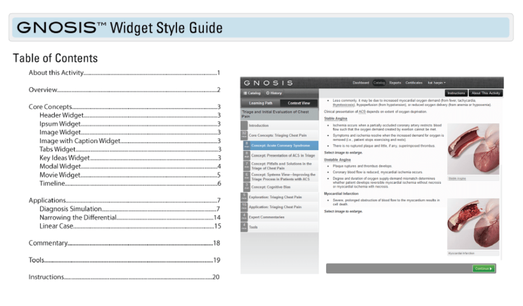 While working at Advanced Practice Strategies, my job was to reorganize PDF training content from SMEs into content that would fit on the GNOSIS platform. The platform designers provided me with a widget style guide to use for designing interactive content. I organized the content according to key learning objectives and then further broke those down into core concepts that could then be chunked into even shorter segments. The interactive content was arranged by exploration topics, case studies, fact checks, applications and additional tools.